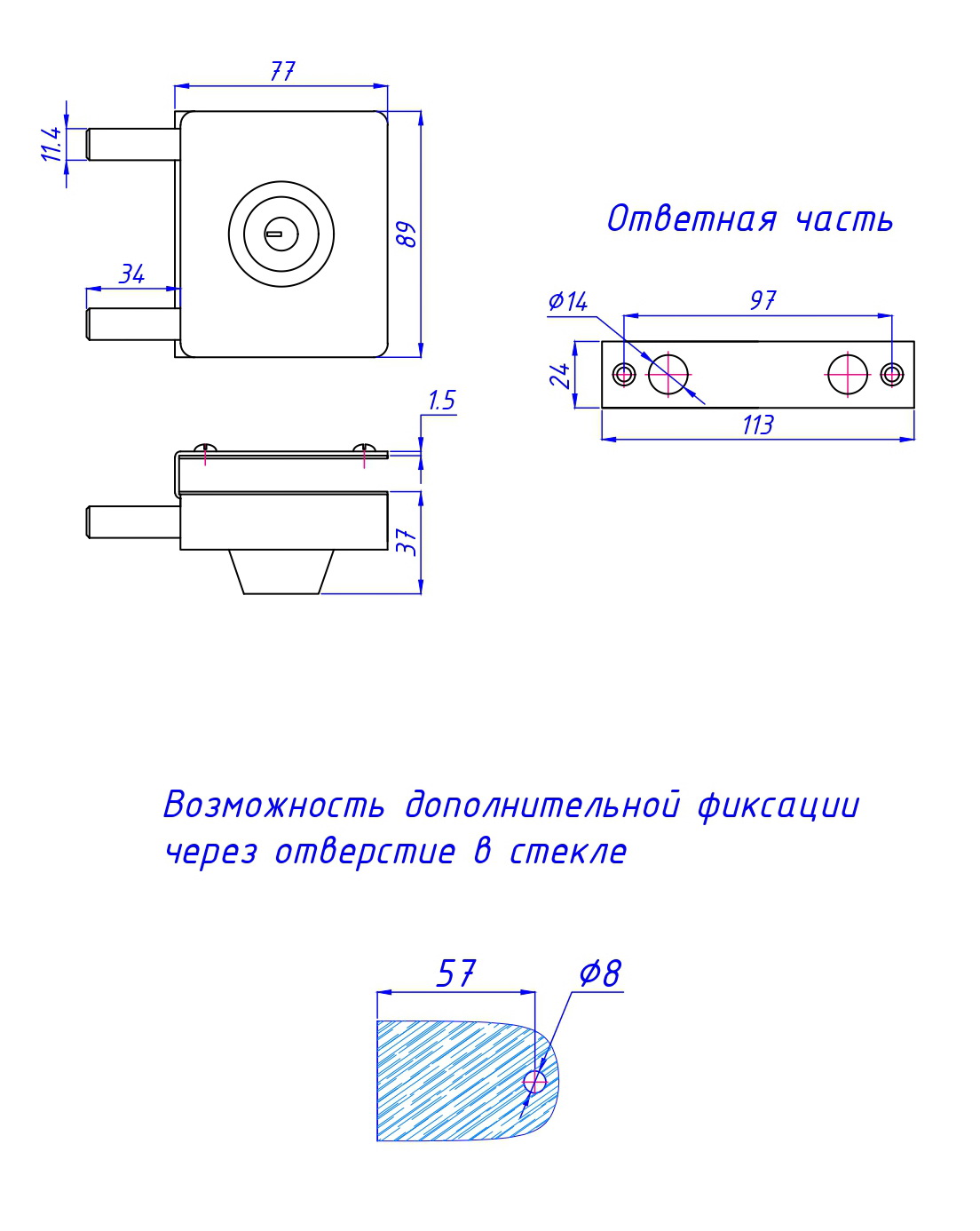 В комплекте ответная часть на стену/в пол и 3 ключа.